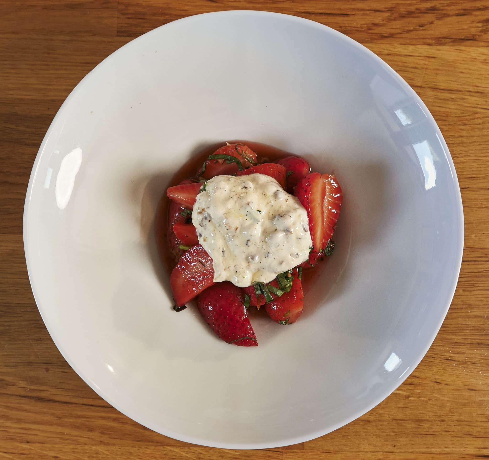 Macerated Strawberries with Fig Leaf Syrup, Crème Fraîche, Toasted Pine Nuts