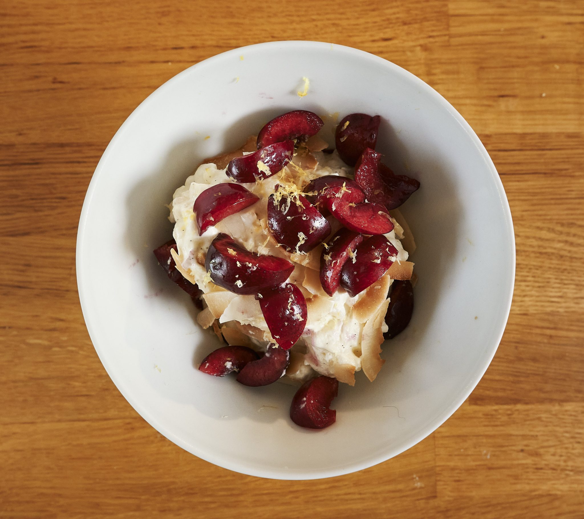 Cold Rice Pudding with Balsamic Cherries, Coconut & Lime