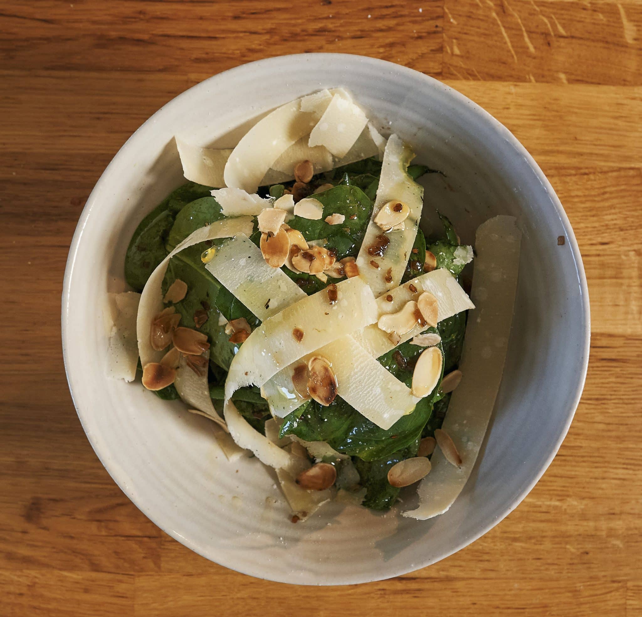 Spinach, Parmesan & Crispy Bean Salad with Toasted Almonds and Bacon Shallot Dressing