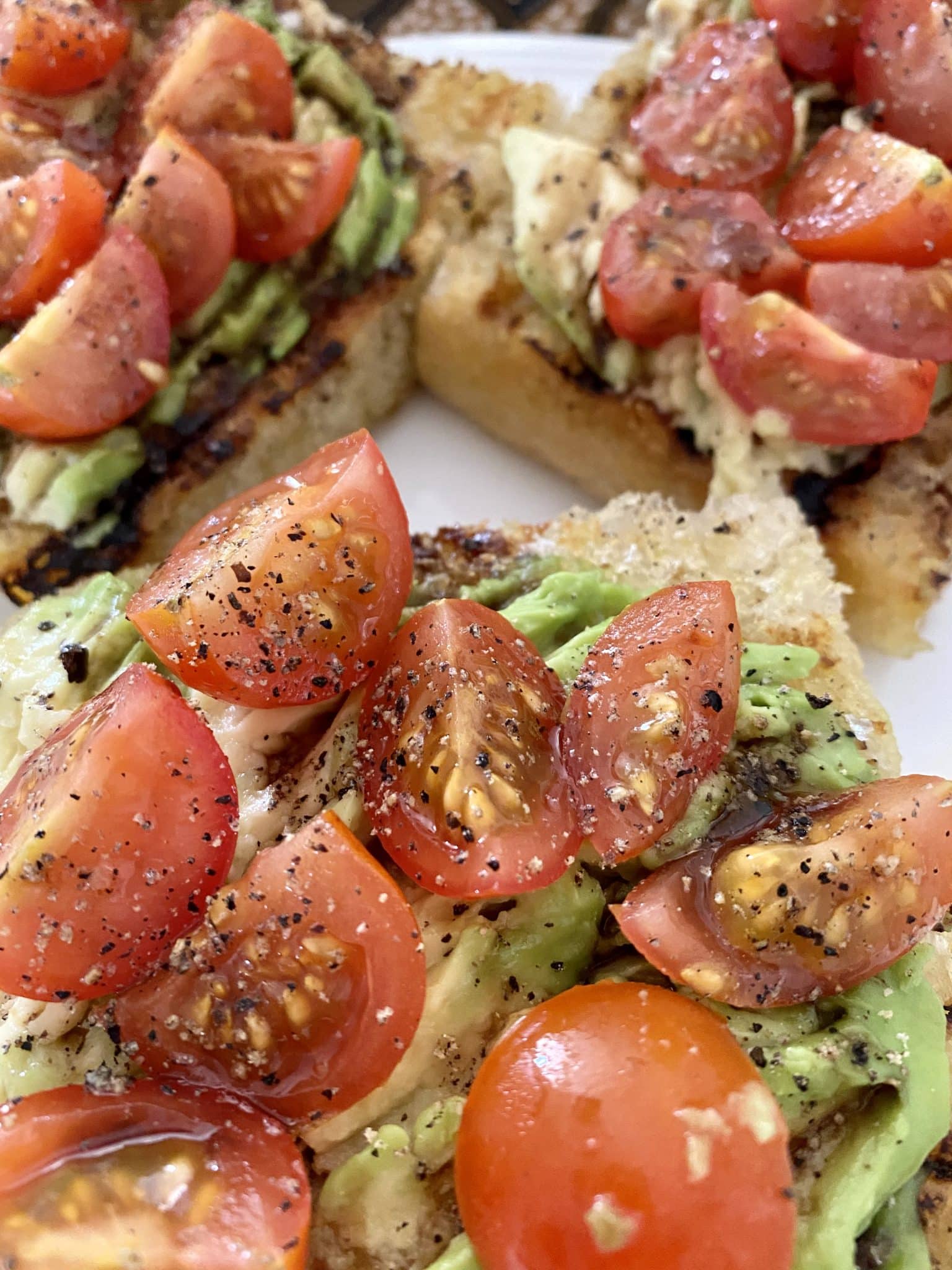 Crushed avocado on grilled focaccia with marinated cherry tomatoes